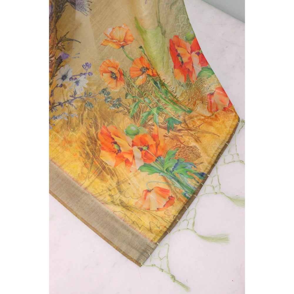 Women's Linen Digital Print Saree With Unstitched Blouse 5.5Mtr
