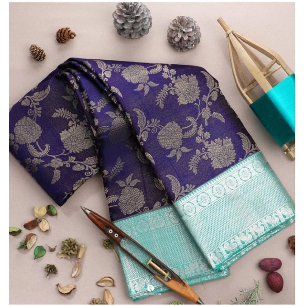 Generic Women's Soft Litchi Silk Jacquard Work Saree With Unstitched Blouse 5.5Mtr (Blue)